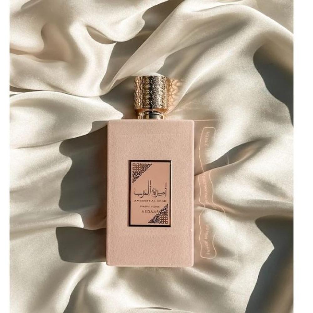 Ameerat Al Arab Prive Rose Asdaaf عطر زهري - فواكه للنساء . هذا عطر جديد Ameerat Al Arab Prive Rose صدر عام 2023. إفتتاحية العطر الفراوله, العنب و البرتقال; قلب العطر الورد, المسك الأبيض, الياسمين, الغاردينيا, الزنبق و الإيلنغ; قاعدة العطر تتكون من حبوب التونكا, العنبر و خشب الصندل.
