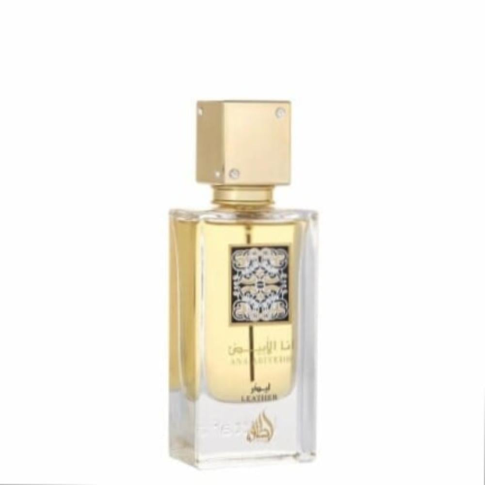 يأتي عطر لطافة أنا أبيض ليذر في زجاجة أنيقة تعكس فخامته وتصميمه العصري. الزجاجة المصنوعة من الزجاج الأبيض تكشف عن اللون الذهبي للعطر، مما يعكس شعوراً بالفخامة والأناقة.